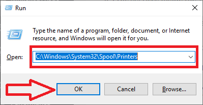 - Then, open the Run dialog box and type C:\Windows\System32\Spool\Printers and click on OK.