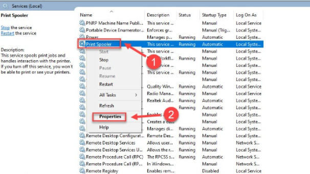 - Thereafter, agin go to the print spooler and right-click on it > Select Properties