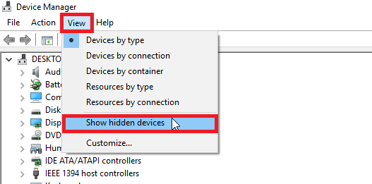 - Go to the Device management tool and tap on “view” option. Then click on “show hidden devices” option from the top.