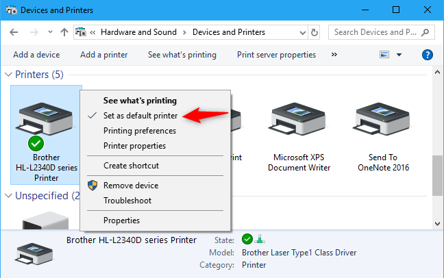 • On the next screen, select your Brother Printer, right-click and tap on ‘Set as Default Printer’ option.
