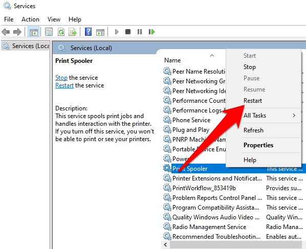 • Now, return to the “Services” and search for “Print Spooler” and right-click on it. Thereafter, choose the “Start” or “Restart” option.