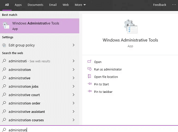 • Then, go to the ‘Start’ button> type in ‘Administrative Tools’> then click on ‘Services’.