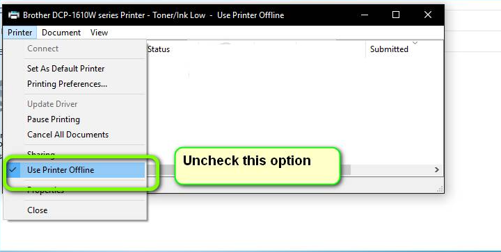 Make sure your printer status must be unchecked from the ‘Offline’ status otherwise it may give an error.