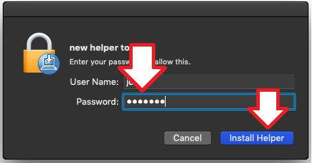 - On the next screen asking for your name and password, type your password to enable the helper tool to be installed. Thereafter click on “Install” option.